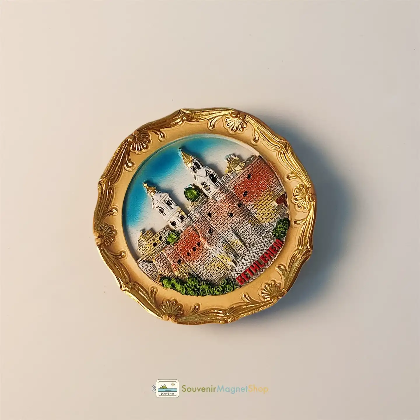 Meticulously hand-painted with vibrant colors, the magnet features a detailed relief of the church’s intricate facade and surrounding buildings, all framed by an elegant, ornate golden border that adds a touch of regal charm to this sacred scene.