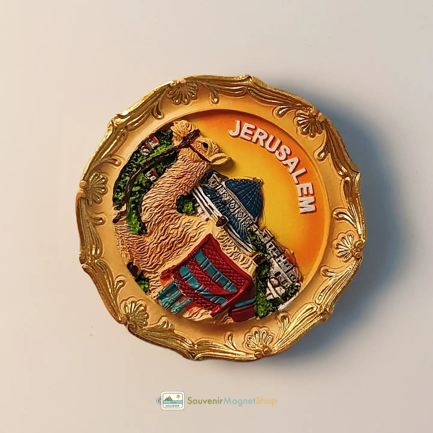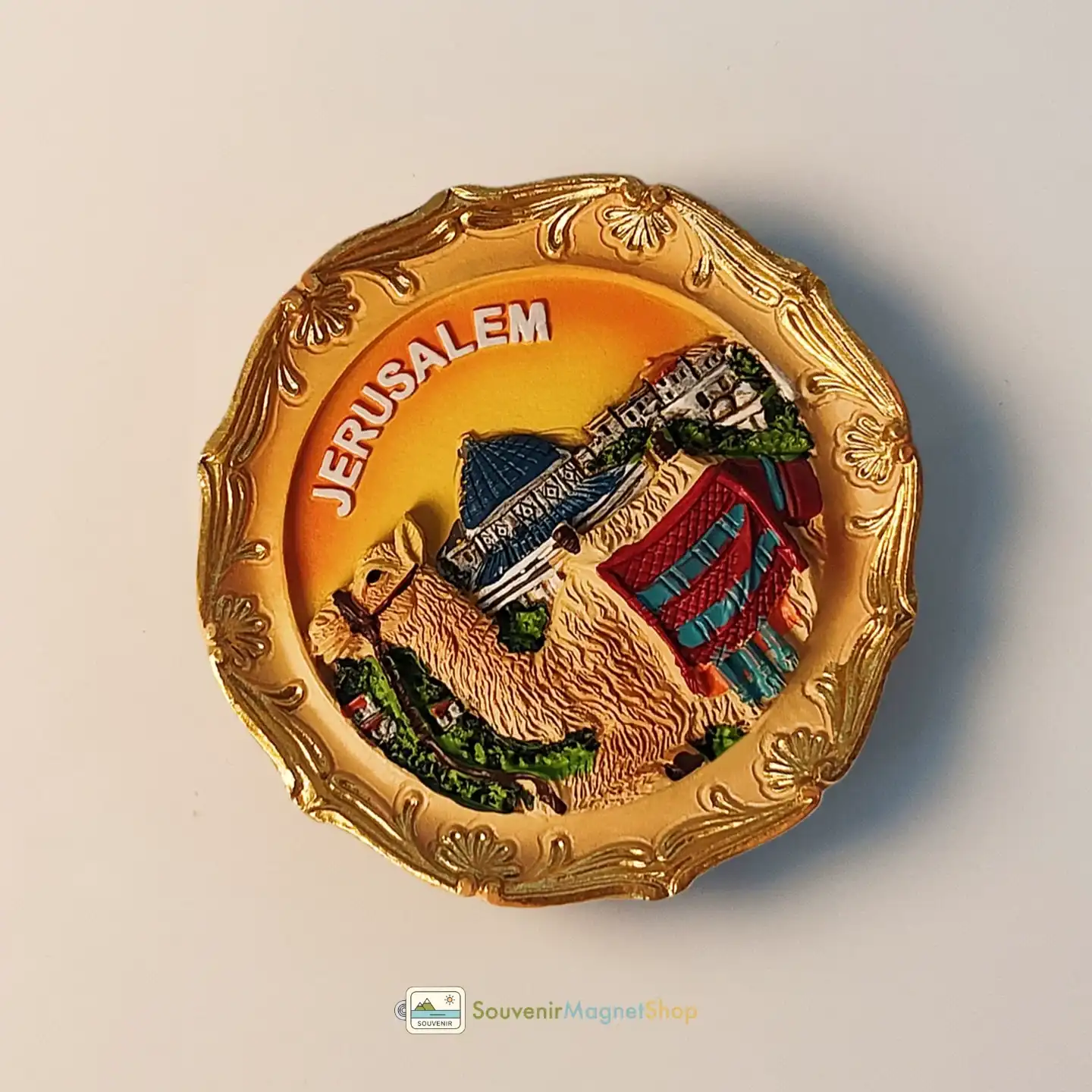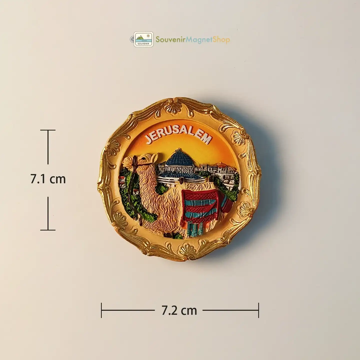 This intricately designed fridge magnet captures the essence of Jerusalem with its prominent depiction of the iconic Dome of the Rock and a majestic camel, a symbol of the region’s desert landscape and ancient trade routes.