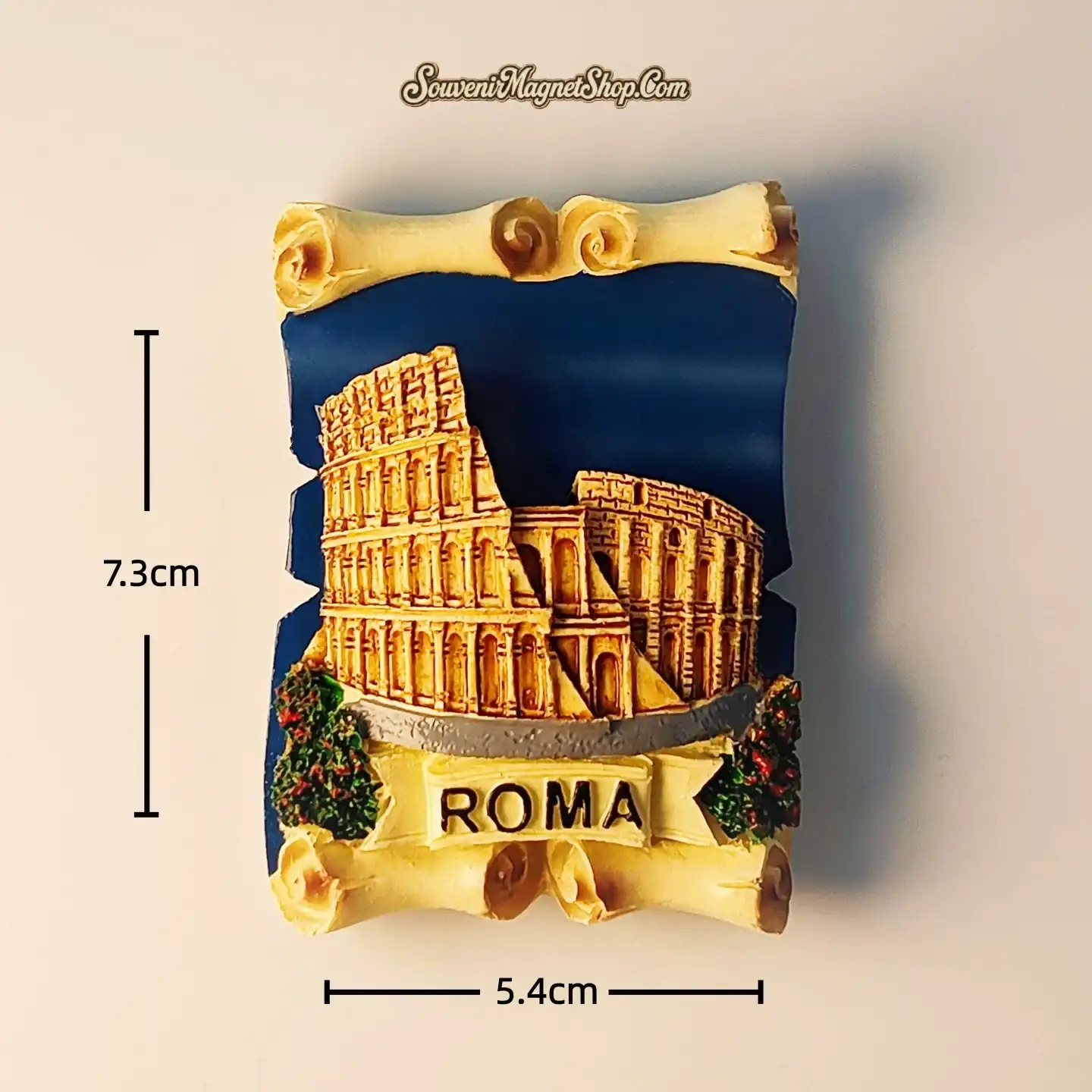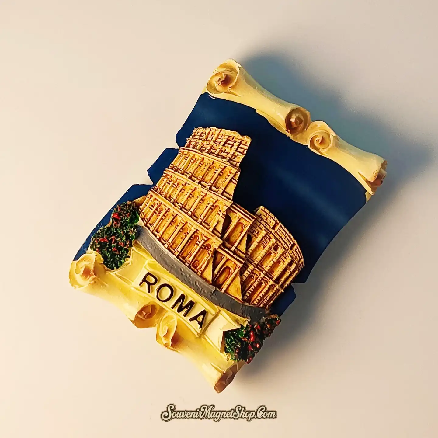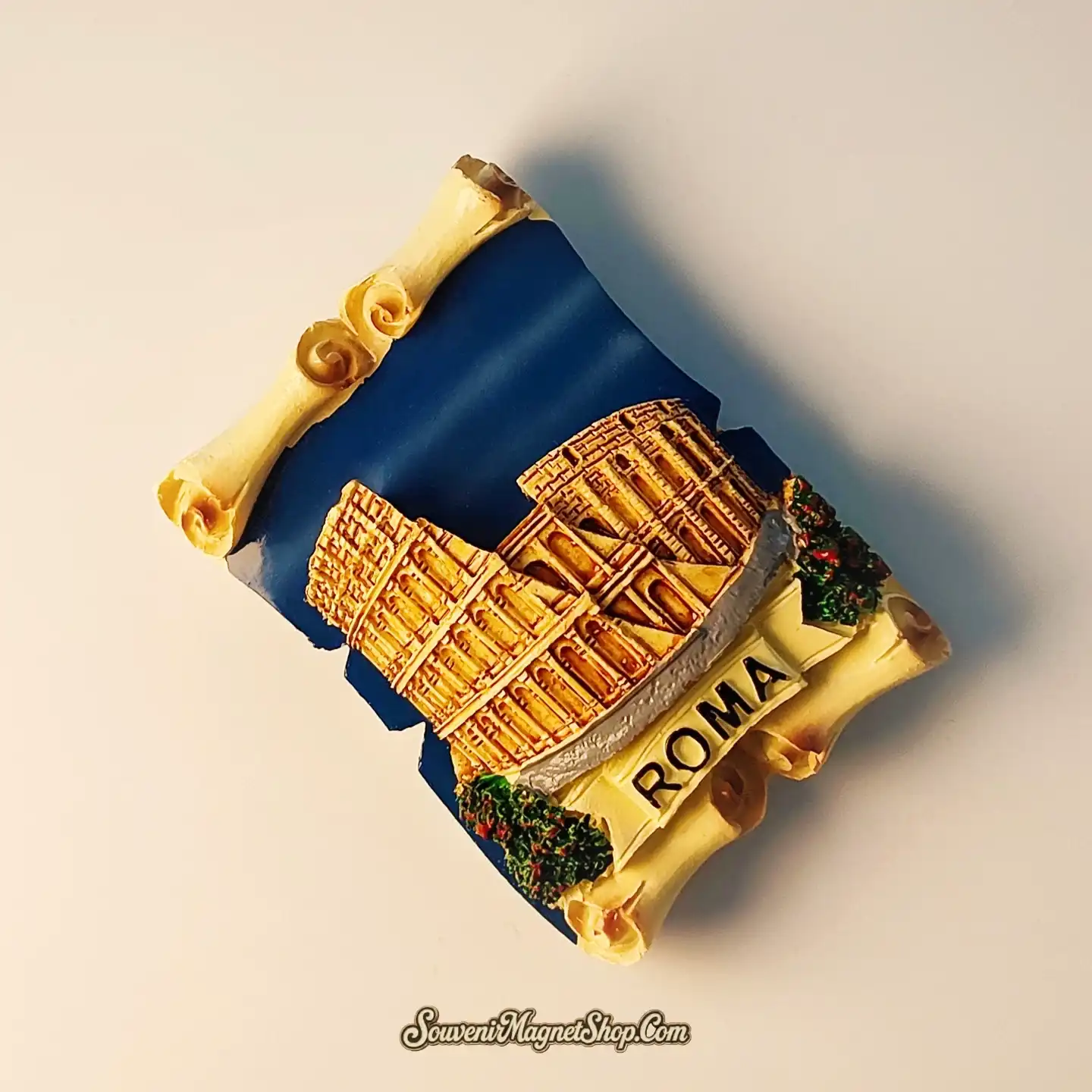 This creative fridge magnet reimagines the majestic Colosseum through a unique vintage scroll aesthetic, appearing like an ancient parchment unfolding to reveal Roman history.