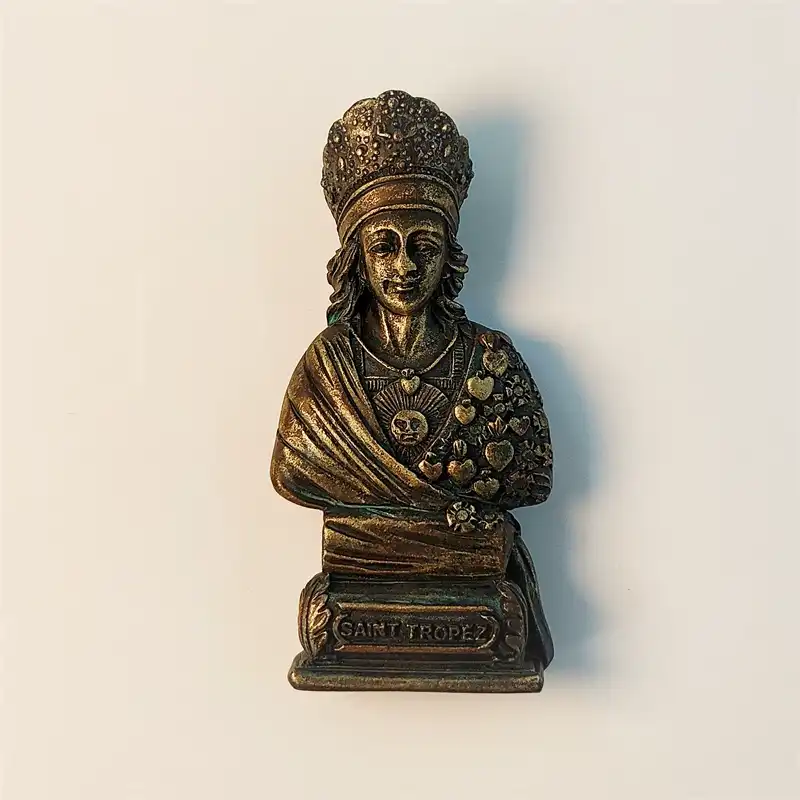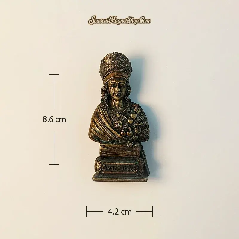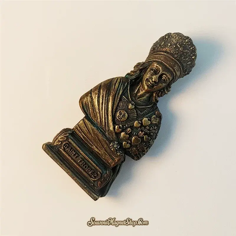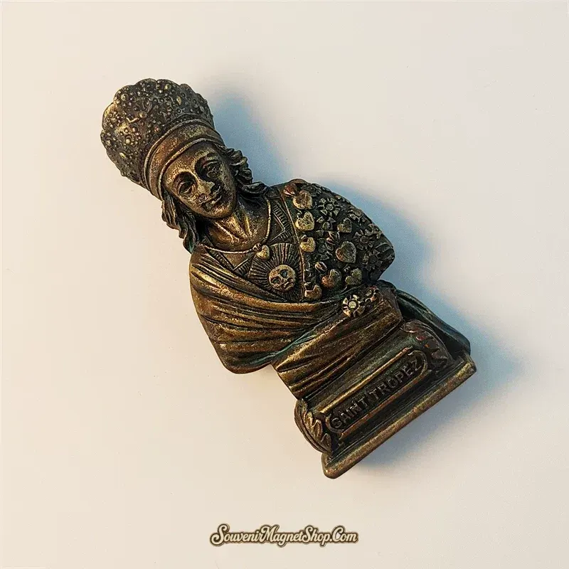 This 3D fridge magnet features a detailed bust of Saint Torpes, captured in a classic bronze-finished relief. The design showcases the intricate textures of his crown and the symbolic heart motifs, reflecting the sacred artistry and sculptural heritage found in local Provençal chapels.