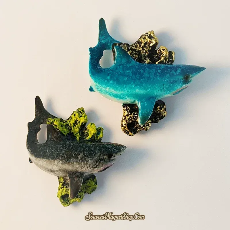 Each magnet is meticulously hand-painted, featuring a distinct shark design – one in a striking blue, evoking the ocean’s depth, and the other in a natural dark hue, both intricately detailed and set against textured, vibrant coral formations.