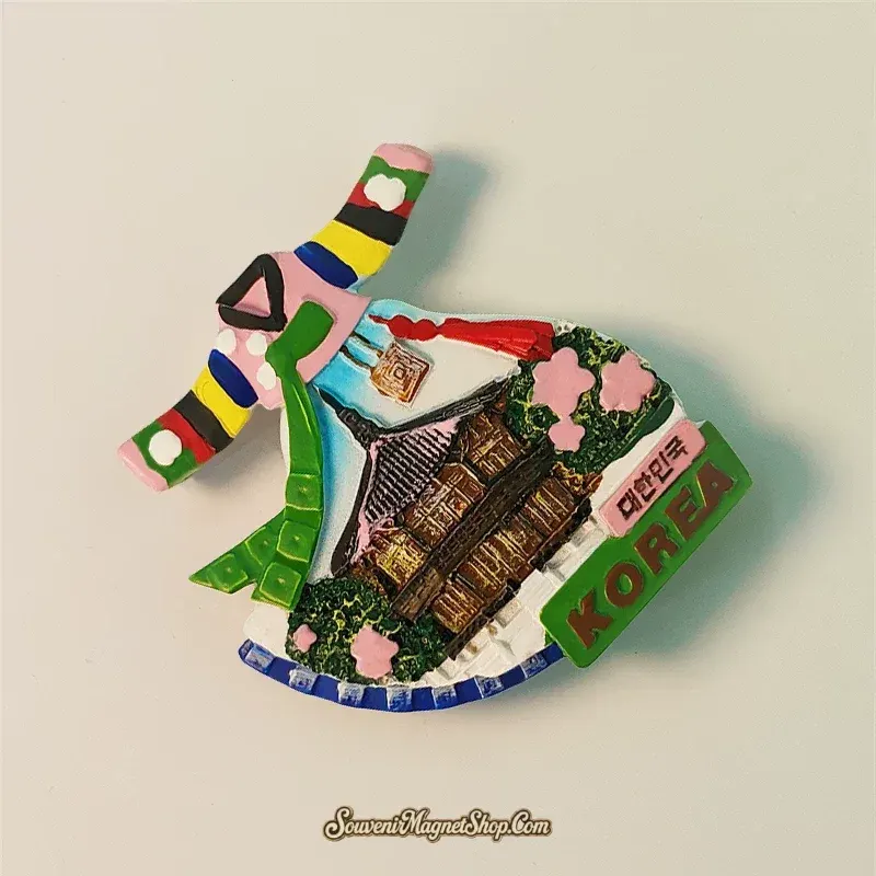 This exquisitely designed fridge magnet uniquely captures the spirit of Seoul, South Korea, in the delightful form of a traditional Hanbok dress.