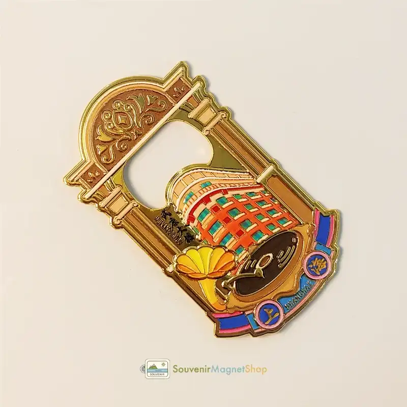 The design also incorporates elements of a gramophone and a record, subtly nodding to the city’s rich cultural heritage and classic charm, all framed within an ornate, golden archway, A unique souvenir and handy bottle opener.