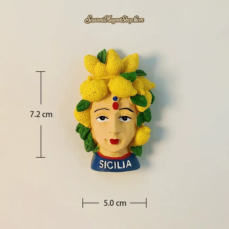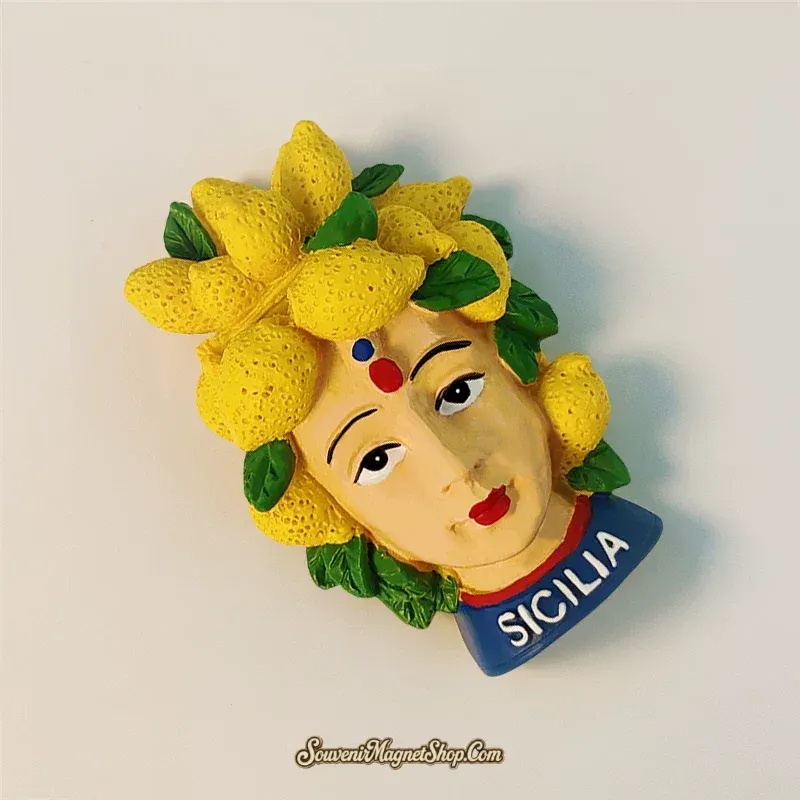 Paired with vibrant lemons, a quintessential emblem of the island’s fertile land and sunny disposition, this magnet evokes the very spirit of Sicily: a blend of ancient narratives, artistic flair, and abundant natural beauty.