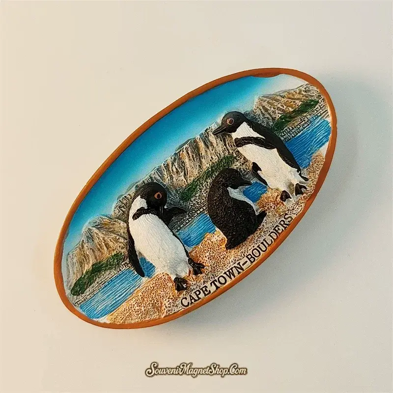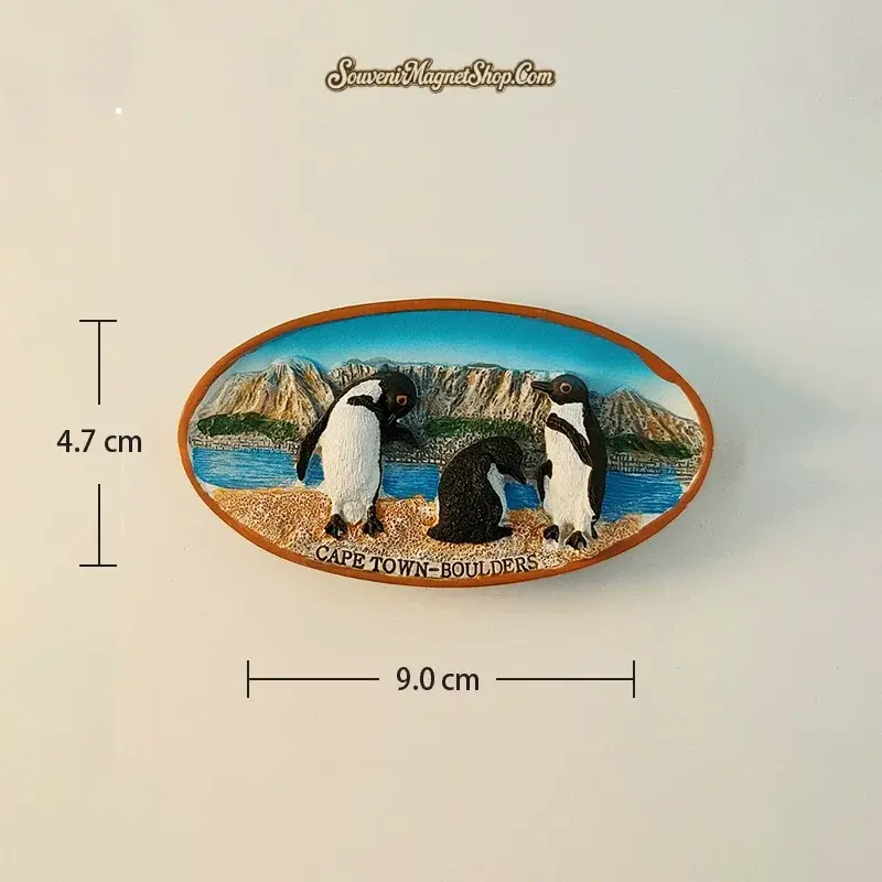 At 9.0 cm wide and 4.7 cm tall, this is a generously sized magnet with excellent visual impact on any fridge or display surface. The wide oval format gives the beach scene room to breathe, making every sculpted detail — from the penguins’ individual feather textures to the granular sandy shore — clearly visible. A perfect Cape Town travel souvenir for wildlife enthusiasts, South Africa travelers, and anyone who has spent a memorable afternoon watching penguins waddle along one of the world’s most beautiful beaches.