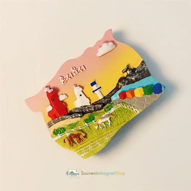 This Jeju Island souvenir magnet vividly captures Iho Tewoo Beach’s iconic red and white horse lighthouses, grazing horses, green fields, and sparkling ocean.