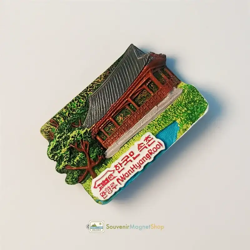 Capture the beauty of traditional Korean architecture with this 3D resin magnet of Wanhyangru (莞香楼) at the Korean Folk Village. A perfect hand-painted travel souvenir.