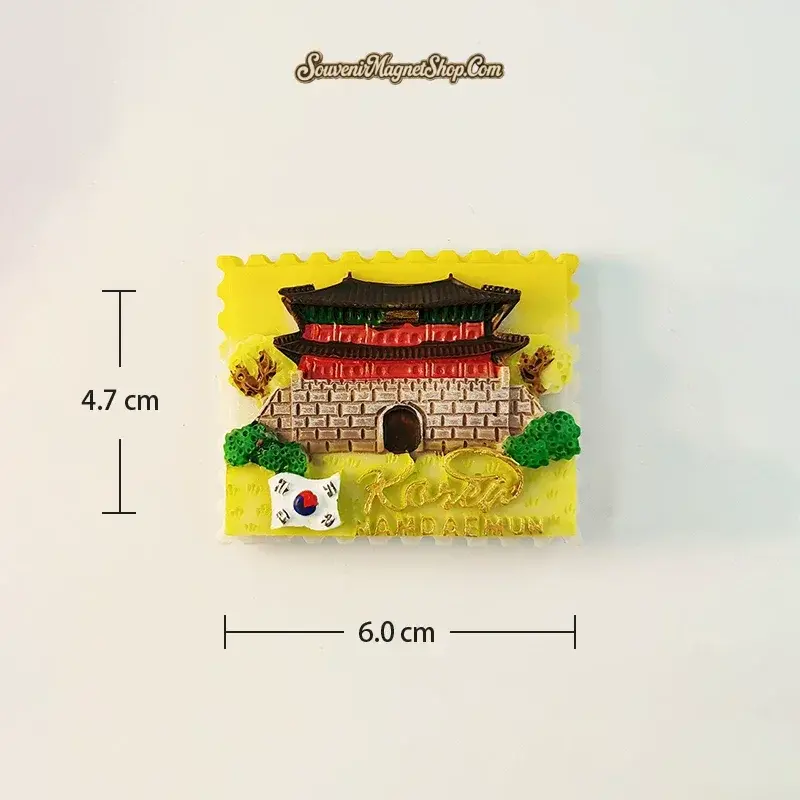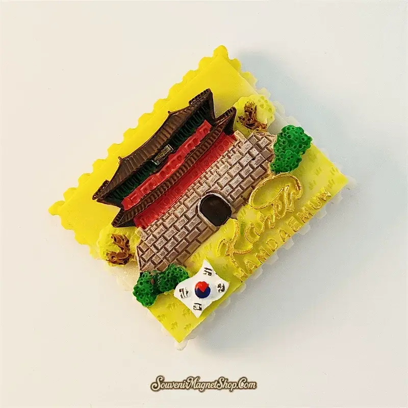 This charming 3D resin fridge magnet presents Seoul’s Namdaemun Gate in a creative postage stamp design, complete with scalloped edges that frame the scene in a playful, collectible format. As a highlight of our Stamp Magnets collection, this piece perfectly blends traditional Korean architecture with a fun philatelic-inspired shape. Against a bright yellow background, the gate rises in stunning relief — its signature two-tiered roof with dark brown curved eaves and vivid red-vermillion walls sits atop a detailed stone base with the iconic arched gateway at its center.