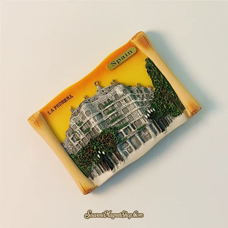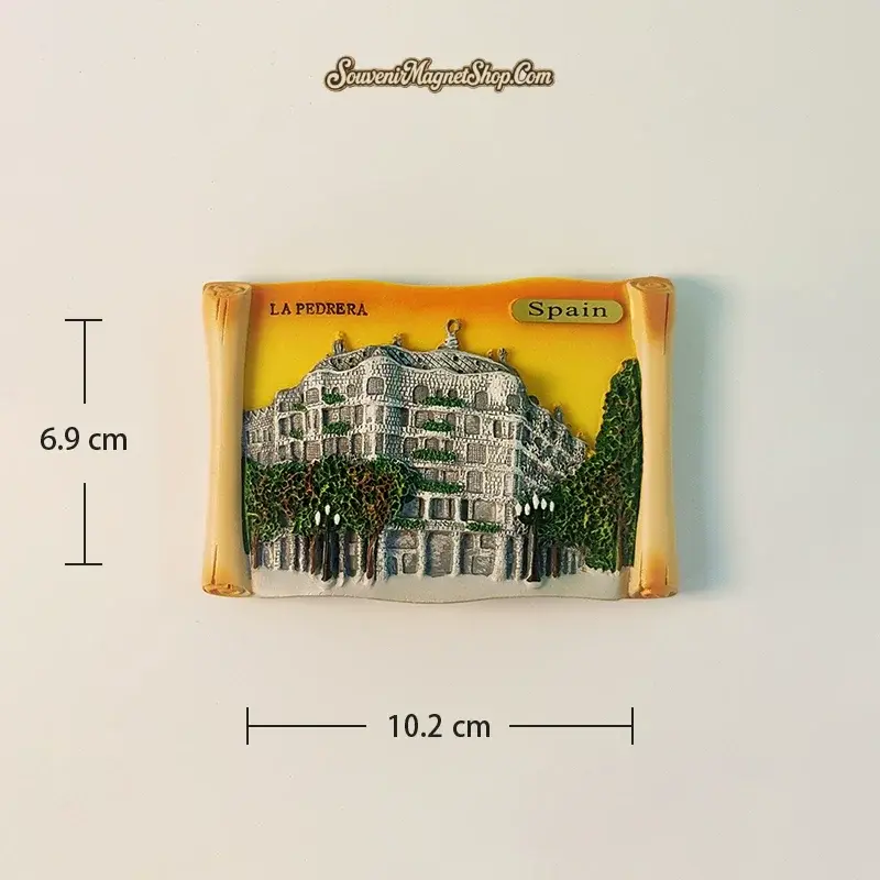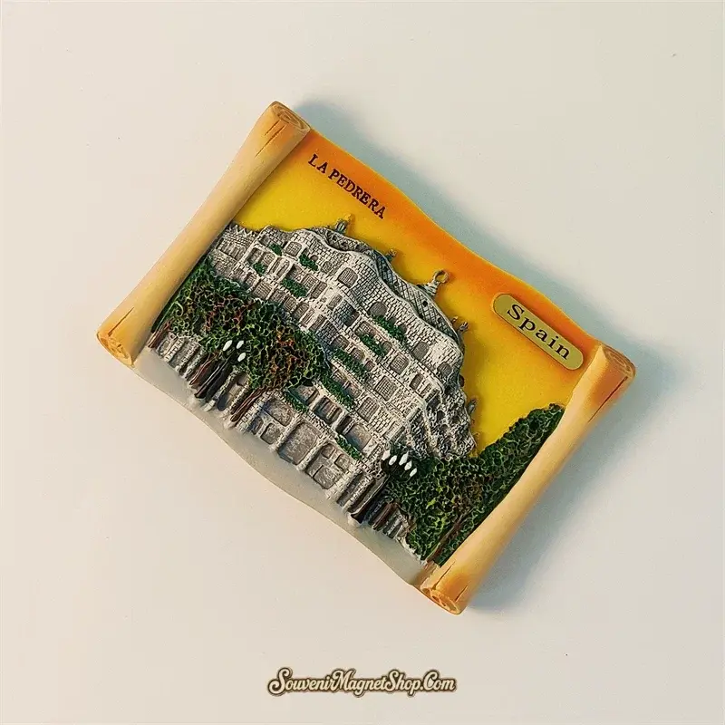 This exquisitely detailed 3D fridge magnet brings Casa Milà to life with vibrant hand-painted accents, enclosed within an elegant scroll design.