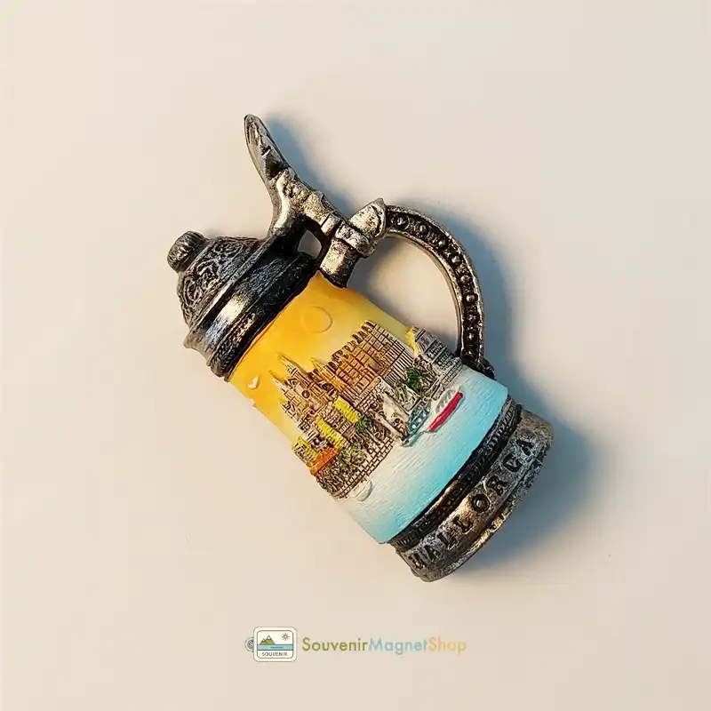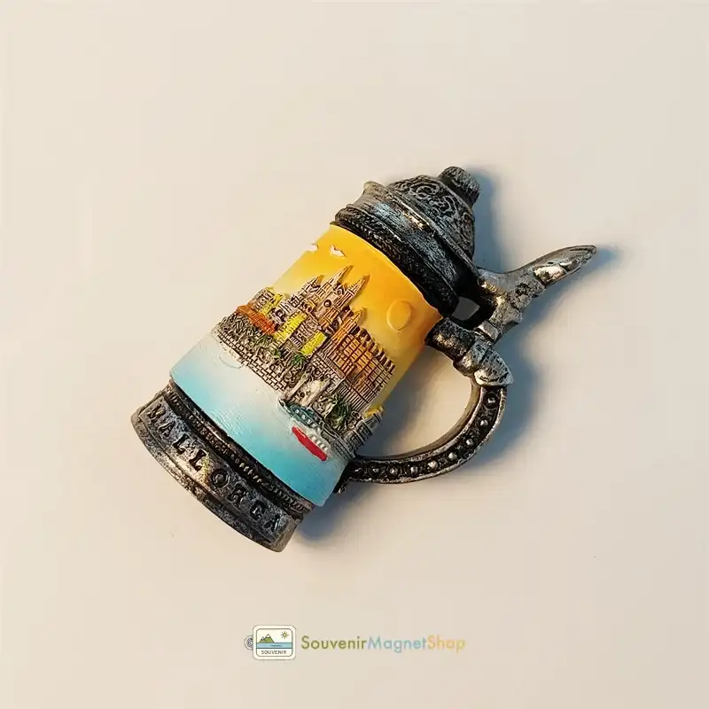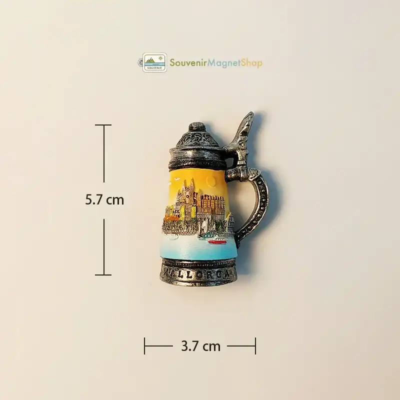 This exquisite 3D resin fridge magnet masterfully replicates a classic beer stein, intricately hand-painted with a panoramic scene of Mallorca’s iconic landmarks.