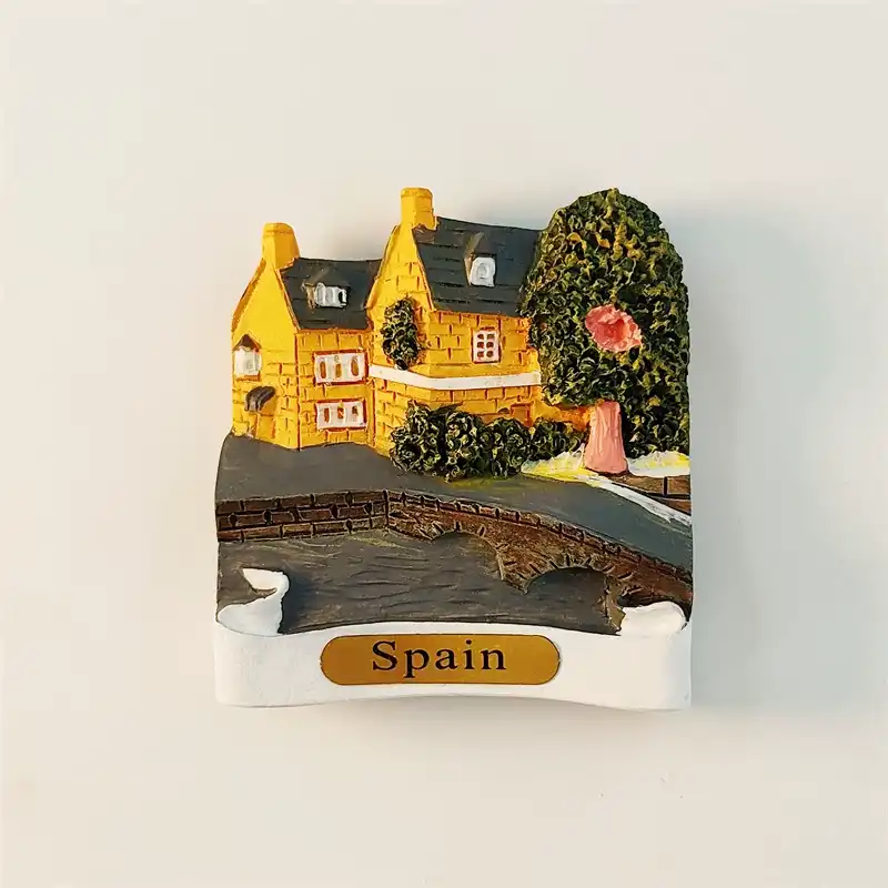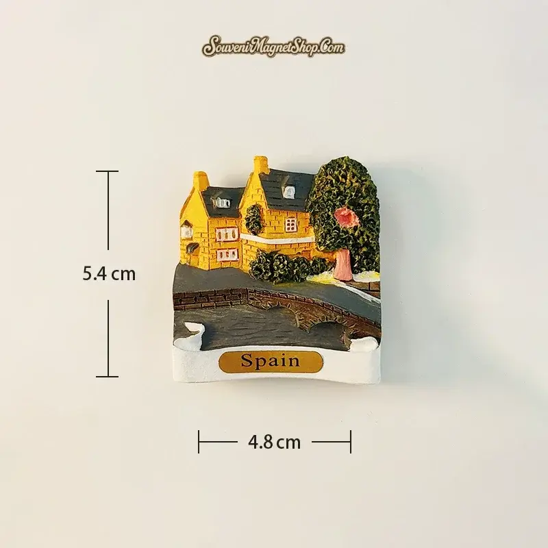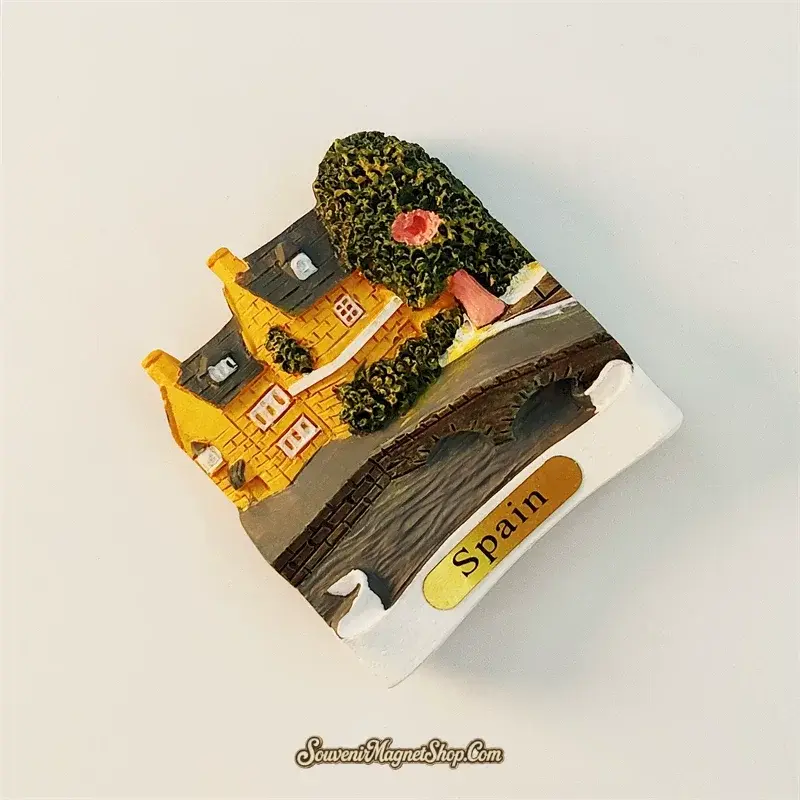 This beautifully crafted 3D resin fridge magnet recreates a classic Spanish village scene in vivid miniature. A golden-yellow stone cottage with dark slate roofs and twin chimneys sits beside a lush green tree dotted with pink flowers. In the foreground, a hand-painted stone arch bridge stretches over a gentle stream, while a figure in a pink dress adds a touch of life to the tranquil setting. A golden “Spain” nameplate completes the design on a clean white base.