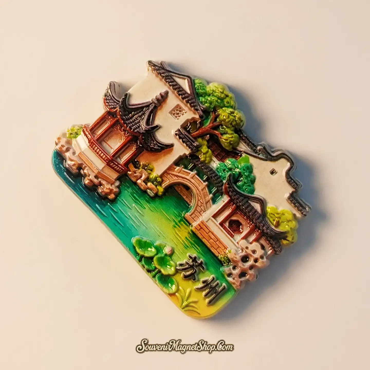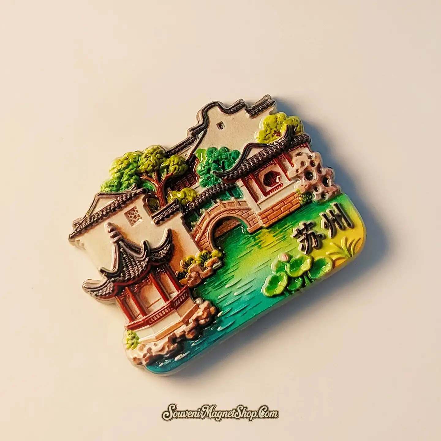 This 3D relief fridge magnet captures the essence of Suzhou’s garden architecture with remarkable precision. Featuring a traditional hexagonal pavilion, a graceful stone arch bridge, and lush green lotus leaves floating on the water, the design brings the serene ‘water town’ aesthetic to life.