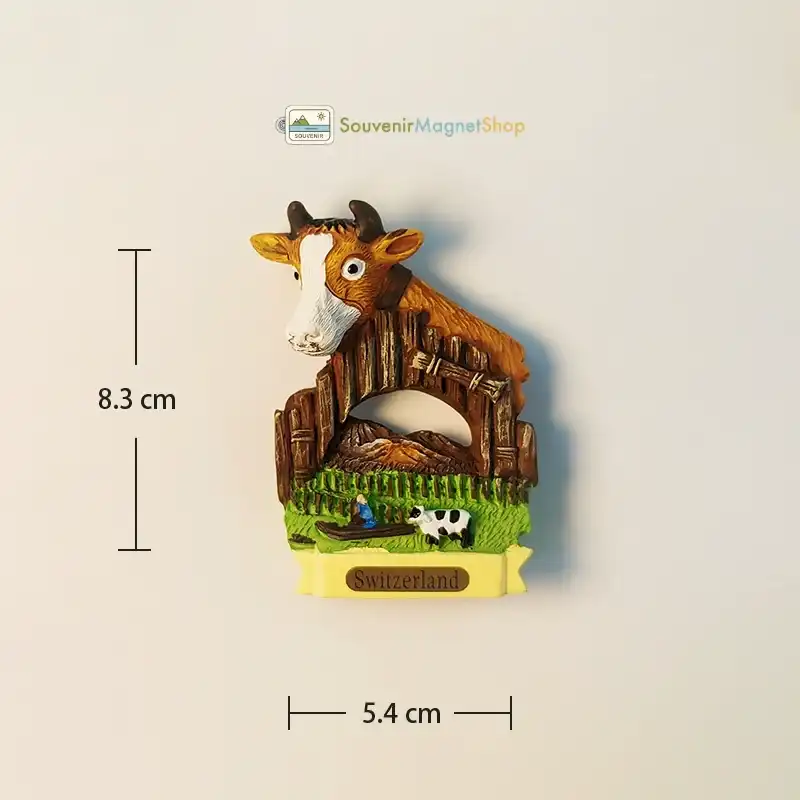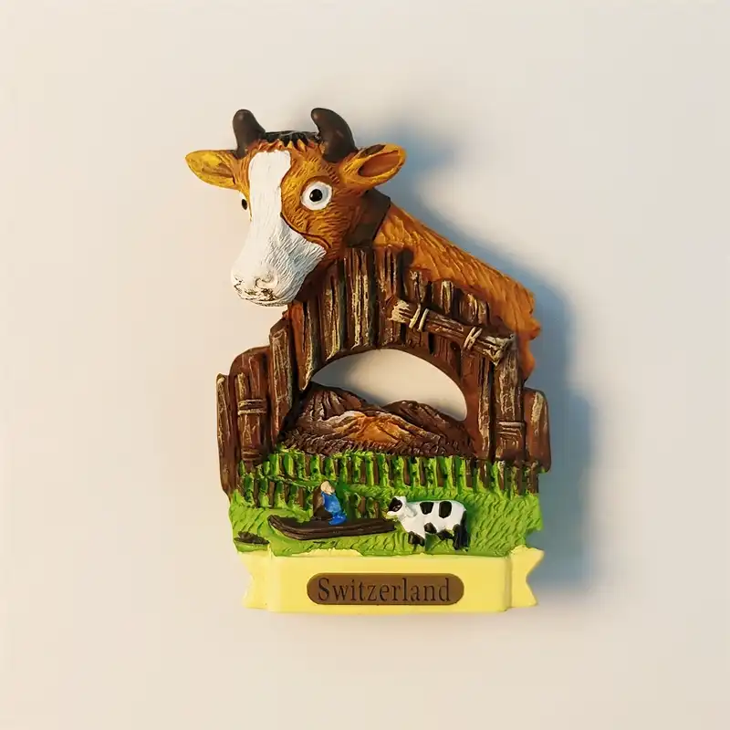 Celebrate Switzerland’s Alps with this 3D resin brown cow fridge magnet, featuring a hand-painted Alpine pasture scene with fences and a smaller cow. A charming souvenir magnet.