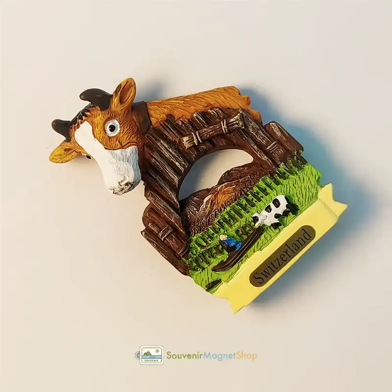 A charming addition to any magnetic surface, this Switzerland Alpine Pasture Brown Cow Fridge Magnet makes a creative souvenir for travelers, a thoughtful gift for collectors, or a delightful way to remember the beauty of the Swiss Alps.
