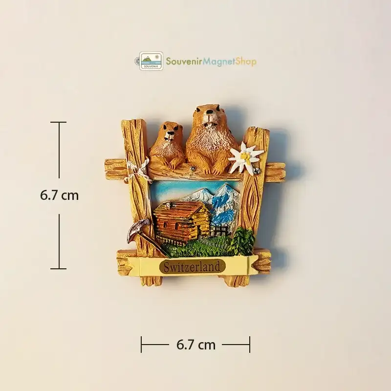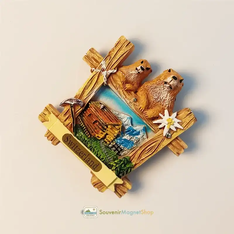 Capture the charm of the Swiss Alps with this 3D resin fridge magnet. Features adorable marmots, the iconic Edelweiss flower, and a rustic wooden frame design.