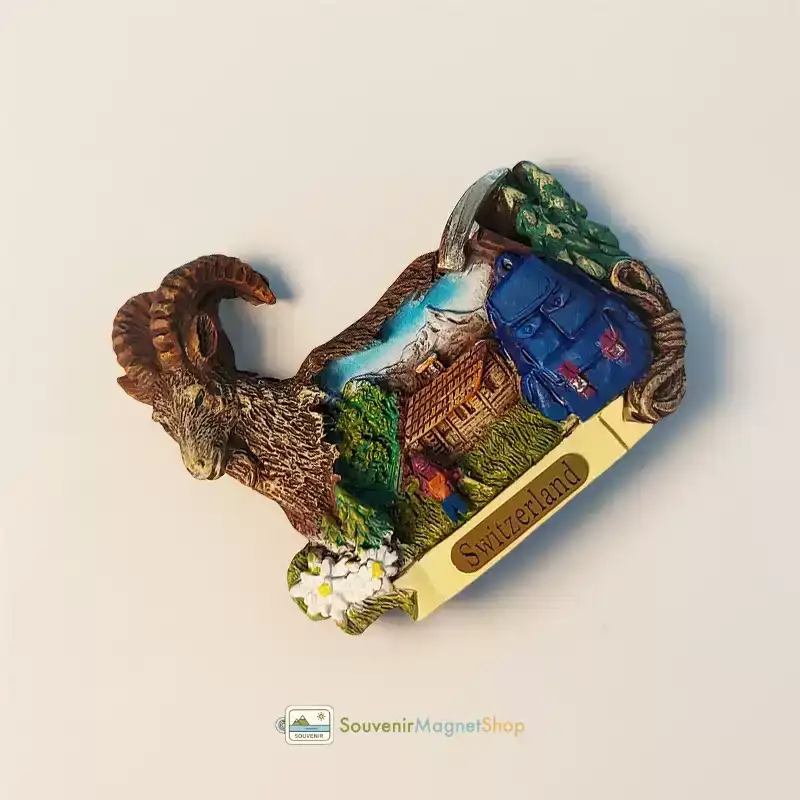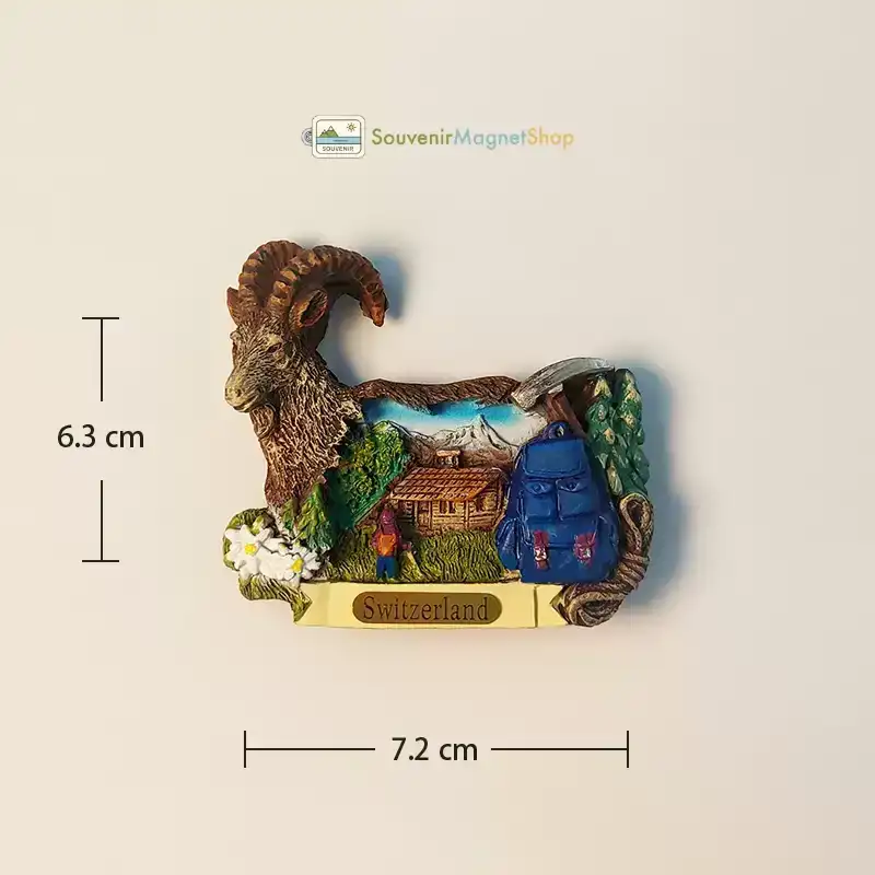 Creative 3D resin fridge magnet featuring Switzerland Alps, ibex, hiking backpack, and cabin. A unique souvenir for travelers and collectors.