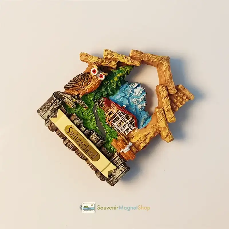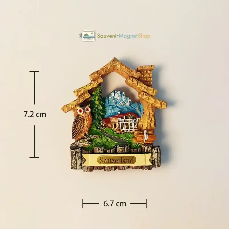 Crafted from high-quality 3D resin, this fridge magnet showcases meticulous hand-painted details. The design vividly depicts a wise owl perched amidst a picturesque Swiss landscape, complete with snow-capped mountains, lush greenery, and a traditional chalet. It’s a delightful miniature scene that brings the magic of Switzerland to your home.
