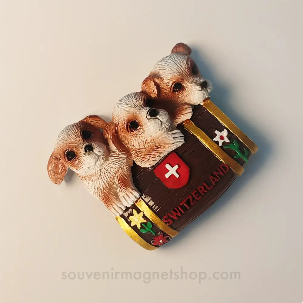 Bring home a piece of Switzerland with this adorable fridge magnet featuring three playful puppies peeking from a creative wooden barrel. A charming souvenir for any dog lover!