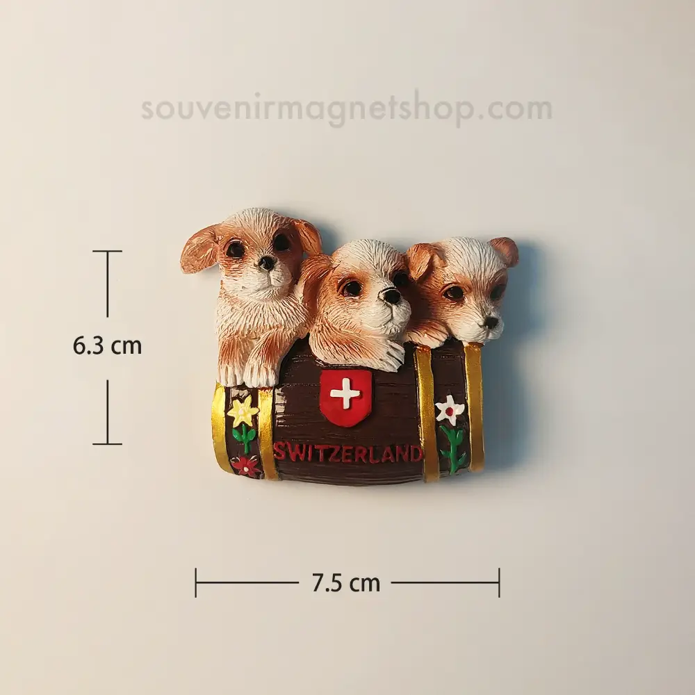 This souvenir fridge magnet features a creative 3D resin design of a small dog with a traditional Swiss barrel, symbolizing the country’s alpine rescue heritage and mountain life. The detailed hand-painted finish highlights the cute and iconic imagery, making it a charming collectible.