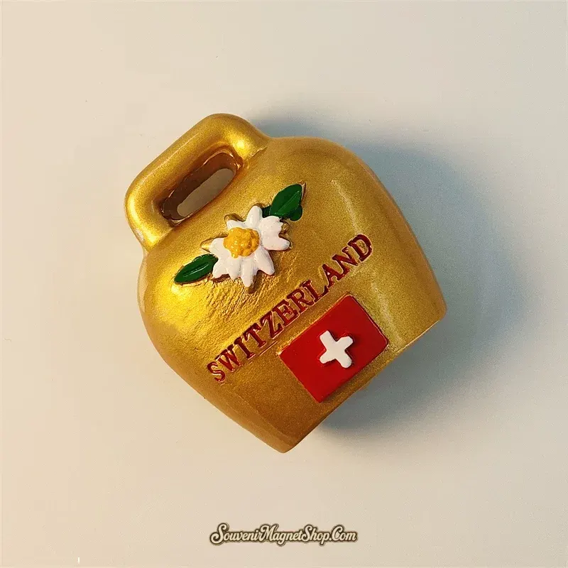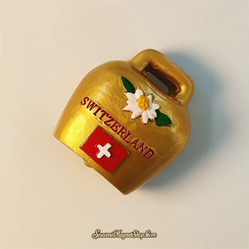 Experience the timeless charm of the Swiss Alps with this iconic golden cowbell magnet. In Swiss culture, the melodic ring of the Trychel or cowbell is the soundtrack of the high meadows, symbolizing the deep-rooted harmony between the mountain folk and their majestic landscape.