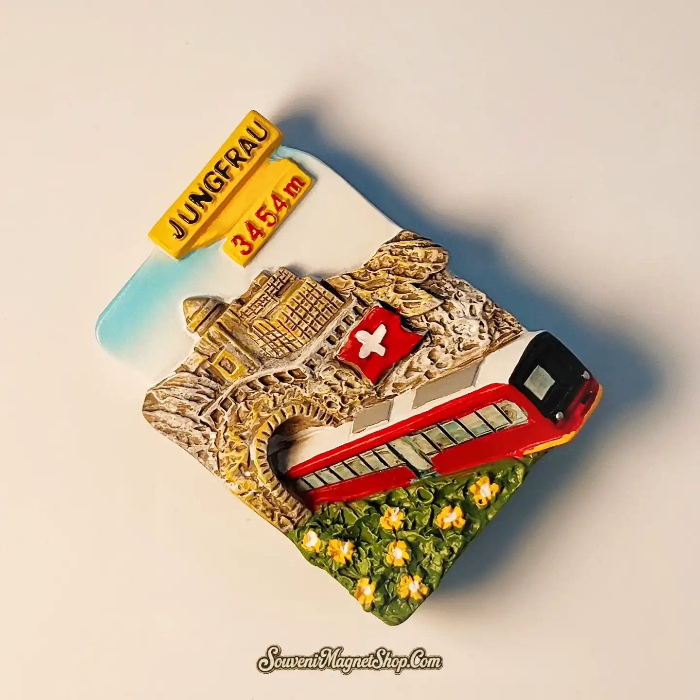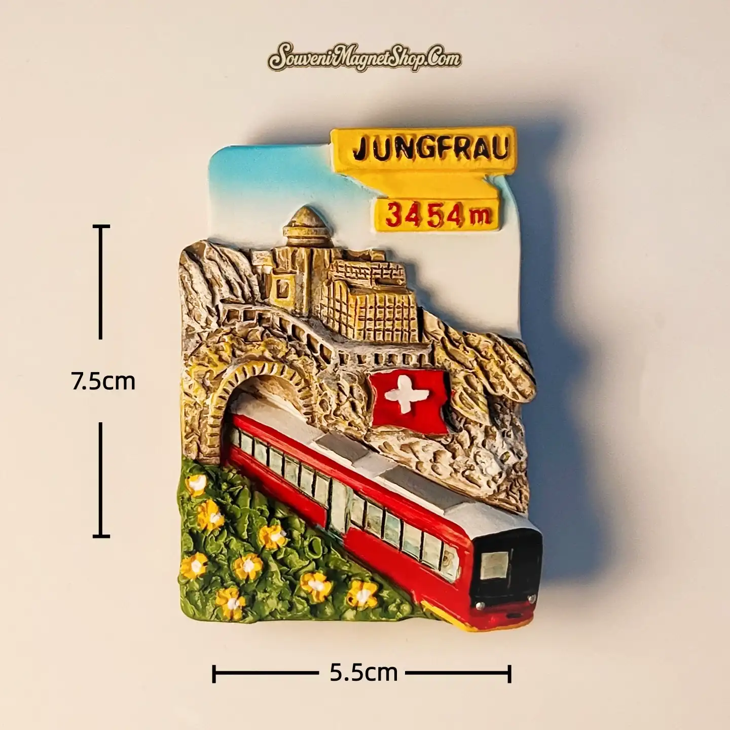 This meticulously crafted 3D resin fridge magnet vividly brings the Jungfrau experience to life. It features the iconic red Jungfraubahn train emerging from a mountain tunnel, surrounded by delicate alpine flowers, all set against the rugged beauty of the Jungfrau peak.