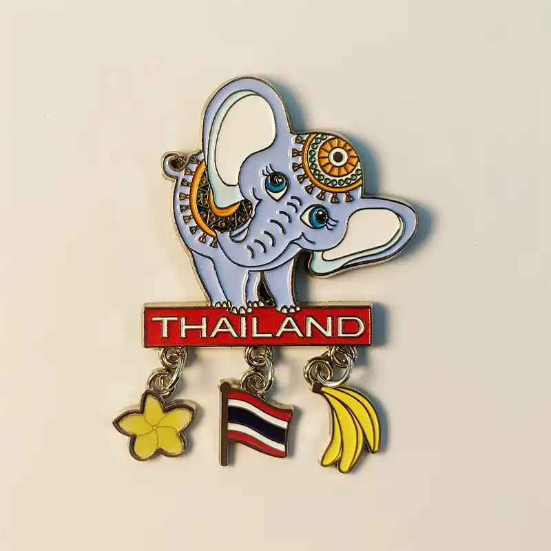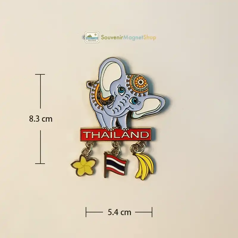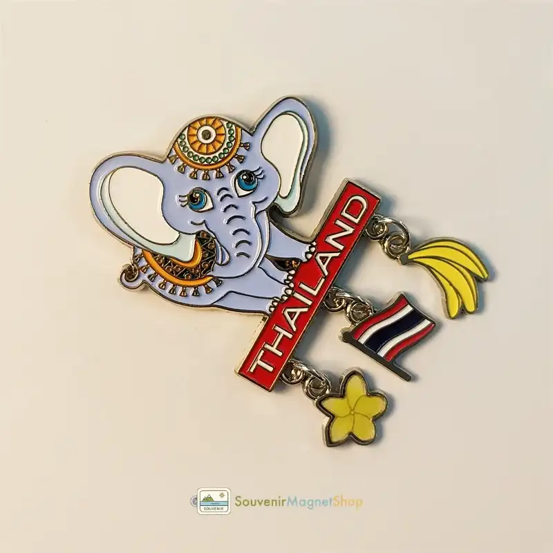 Charming elephant magnet adorned with Thai patterns. Features hand-painted dangling charms: Thailand flag, plumeria, and banana, capturing Thai culture.
