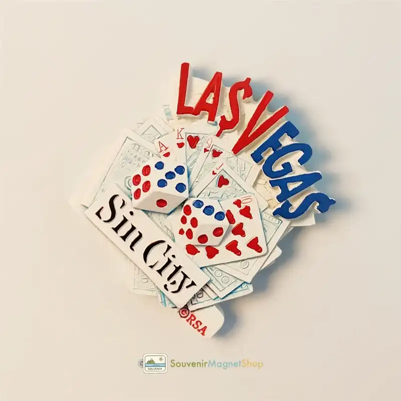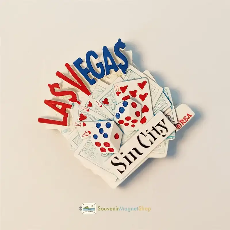 Hand-painted Las Vegas Sin City fridge magnet, featuring dice, playing cards, and “LAS VEGAS.” A vibrant souvenir magnet reflecting the city’s iconic gaming culture.