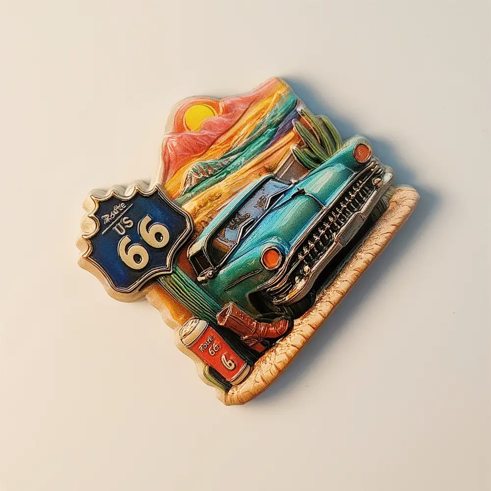 This souvenir fridge magnet features a creative 3D resin design of a Route 66 road sign against a sunset backdrop, capturing the freedom and romance of the open road. The detailed hand-painted finish highlights the warm colors and iconic symbol of America’s historic highway.