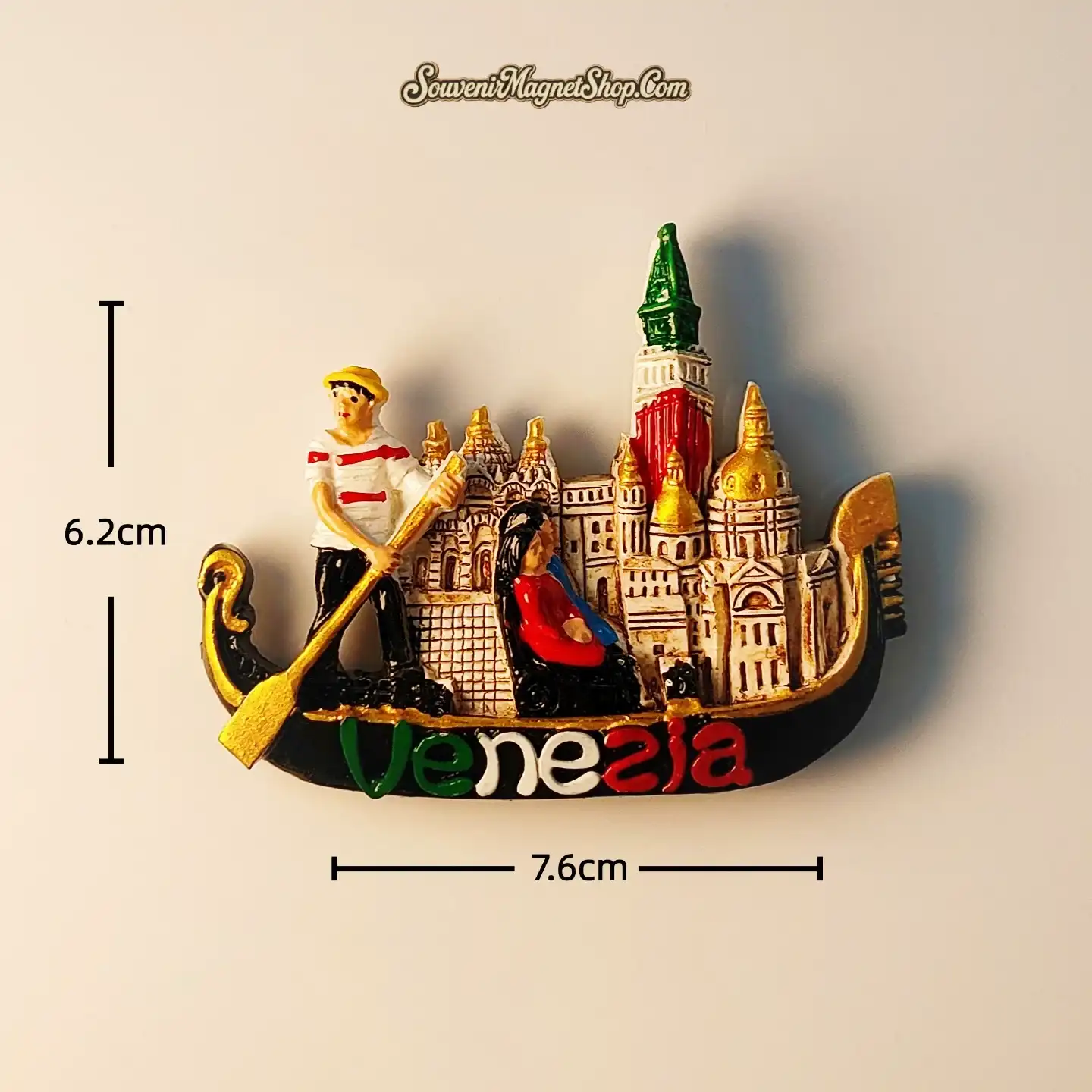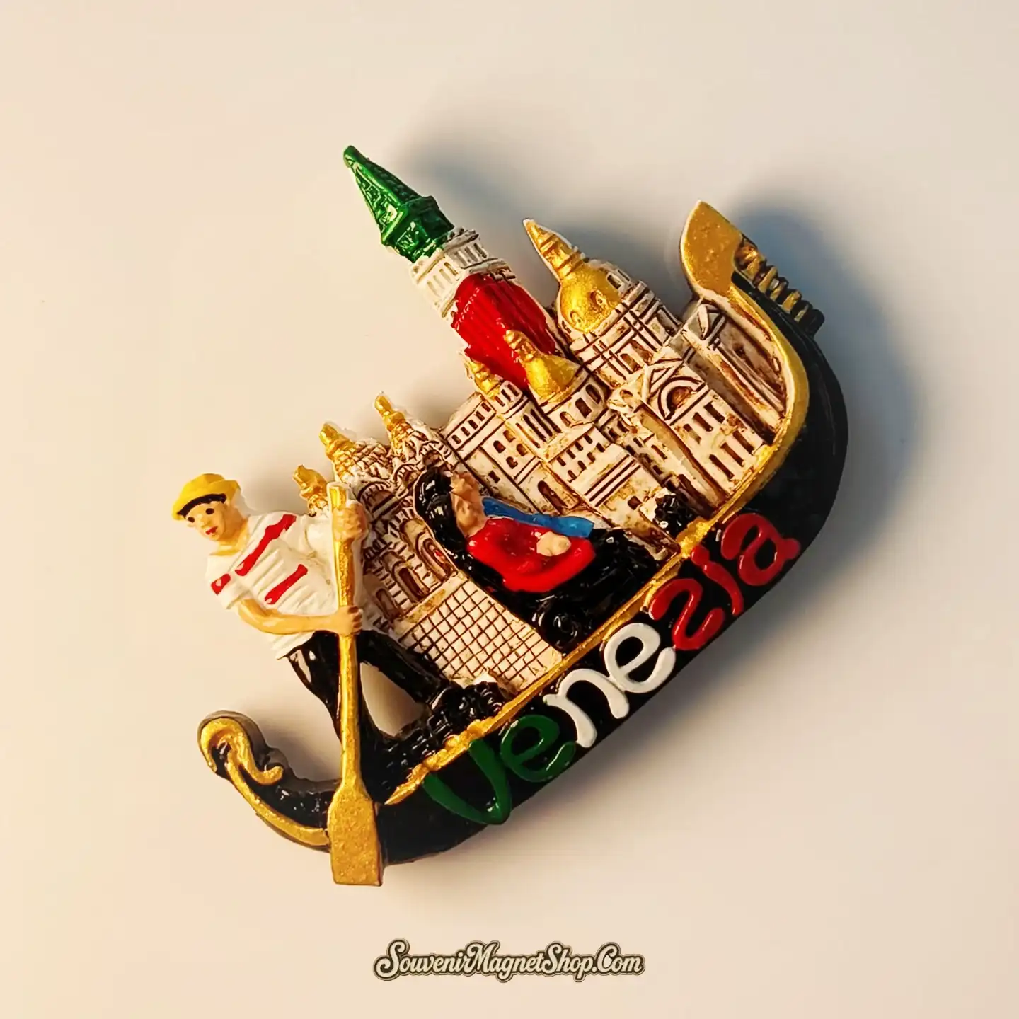 This creative 3D fridge magnet is meticulously hand-painted to bring the spirit of Italy to your home. It features a detailed gondolier in a classic striped shirt steering his boat past the golden domes of St. Mark’s Basilica and the striking red-brick Campanile.