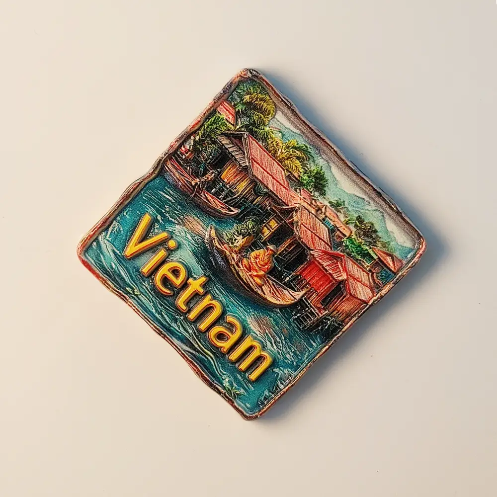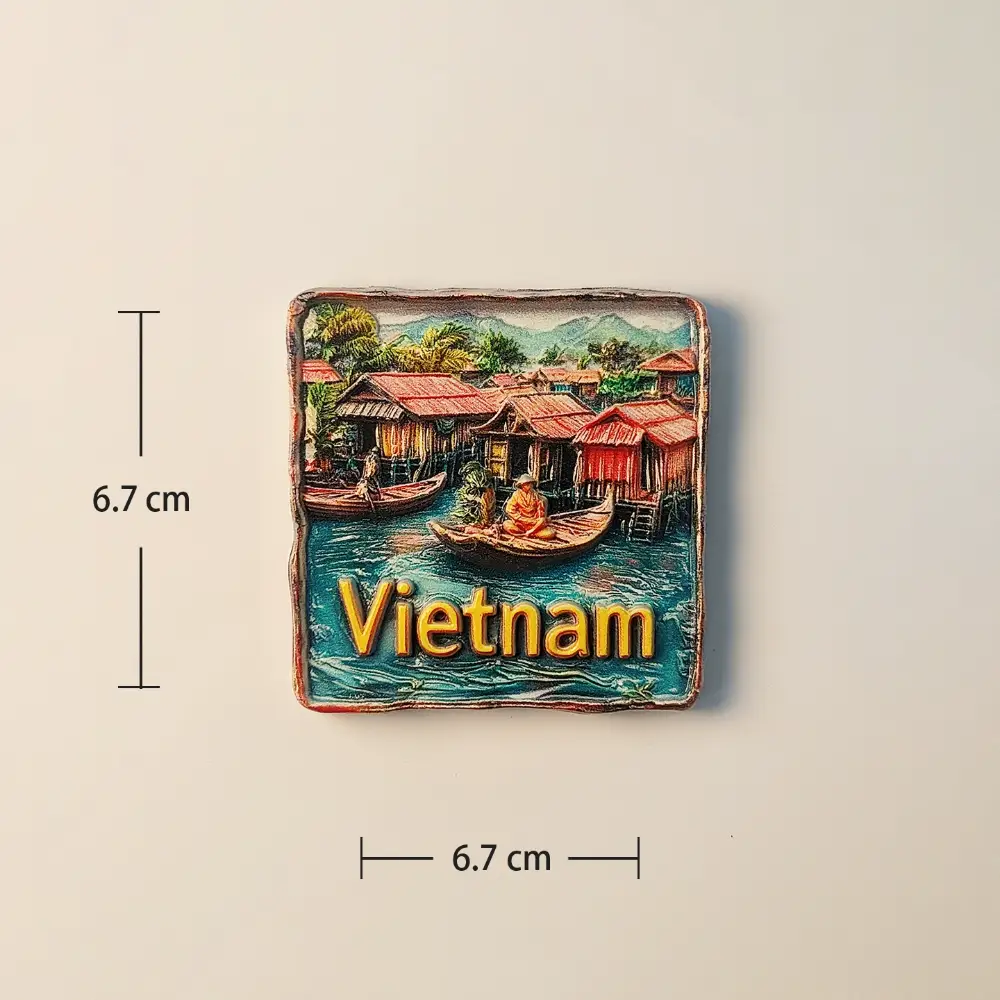 This souvenir fridge magnet features a creative 3D resin design of Vietnam’s traditional stilt houses, beautifully painted to reflect their charm and authenticity. The detailed craftsmanship captures the essence of Vietnam’s waterside culture and everyday life.