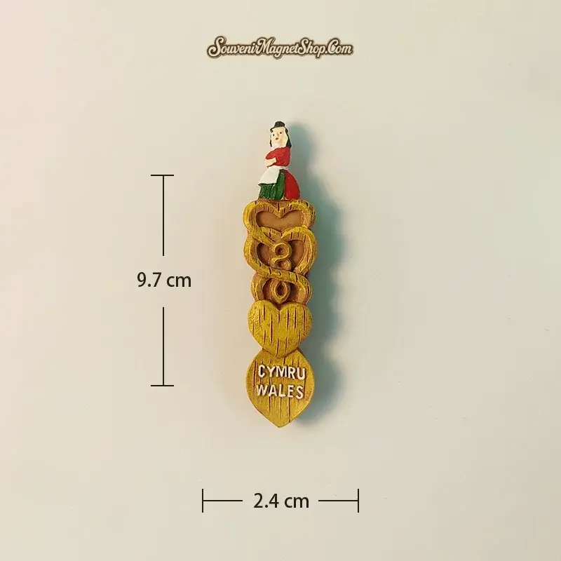 This Wales fridge magnet is shaped like a traditional love spoon — tall, slender, and richly detailed in warm golden amber tones that echo the look of hand-carved wood. A delightful miniature Welsh lady stands at the very top, dressed in full national costume: black stovepipe hat, red bodice, white apron, and green skirt, all painted in vivid detail.